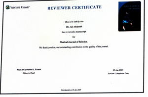 اختير الأستاذ المساعد الدكتور علي محسن الياسري، عميد كلية طب الأسنان، ليكون مقومًا علميًا في مجلة بابل الطبية، وهي إحدى المجلات العلمية المحكمة التي تصدر عن كلية الطب / جامعة بابل.